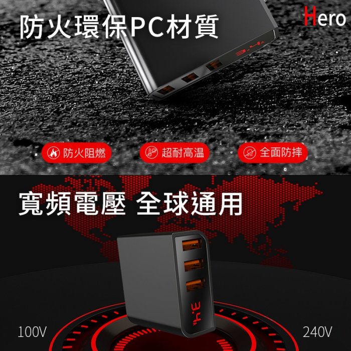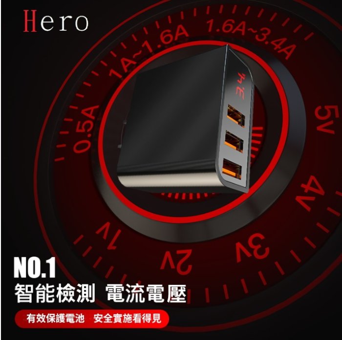 BSMI 認證 3孔充電器 3.4A 快充頭 數位電流顯示 自動斷電 智能充電 三孔 USB 台灣廠商 Hero 充電頭